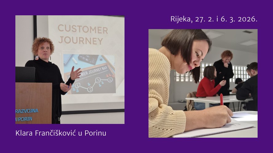 U petak 27. 02. i petak 6. 3. 2026. u Riječkoj razvojnoj agenciji Porin, Klara Frančišković, Eduza edukatorica i savjetnica za korisničko iskustvo održala je radionicu pod nazivom Kreiranje mape korisničkog puta.