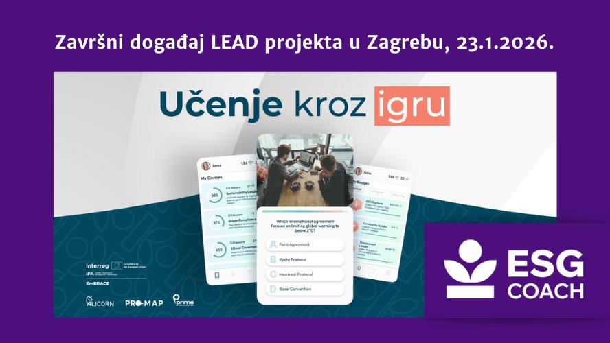 ESG Coach je platforma za samoprocjenu i praćenje ESG napretka, te igrificirana aplikacija za širu primjenu i učenje razvijena kroz LEAD projekt. Platforma istovremeno nudi uvid u ključne nalaze istraživanja, koji pokazuje i lokalne i međunarodne vodiče.
